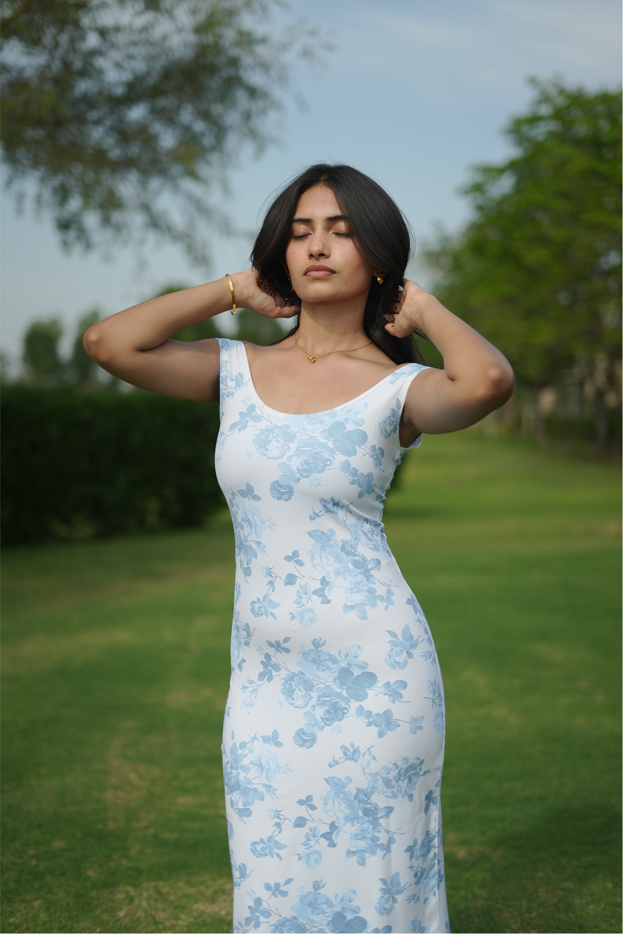 Blair is the epitome of summer in a dress. With its crisp white fabric and delicate sky-blue floral prints, it captures the essence of warm, sunny days. Its versatile design allows you to style it as an off-shoulder, one-shoulder, or a classic strappy dress, according to your liking and comfort. Whether you're lounging in the sun or heading out for a day of fun, this dress is the perfect choice to embrace the sweet spirit of summer.