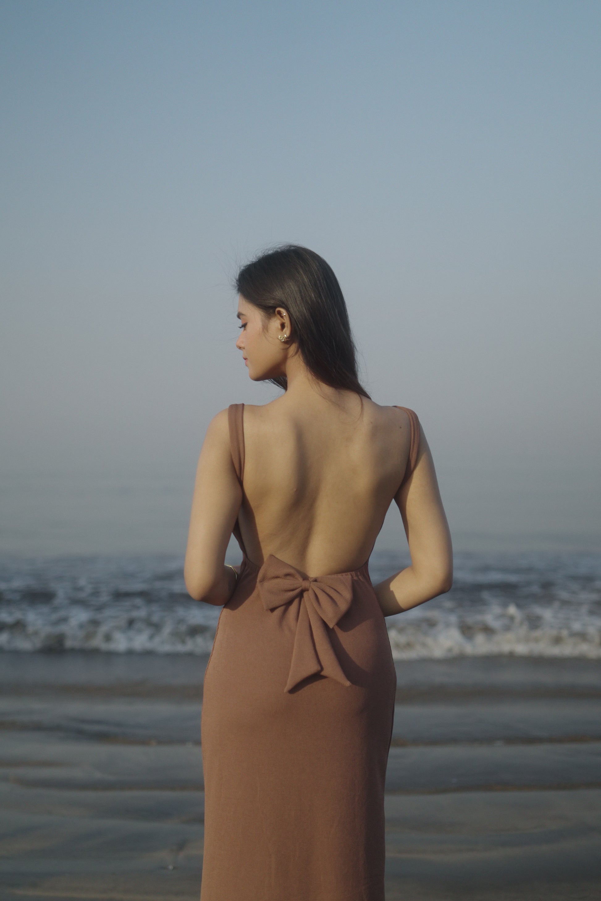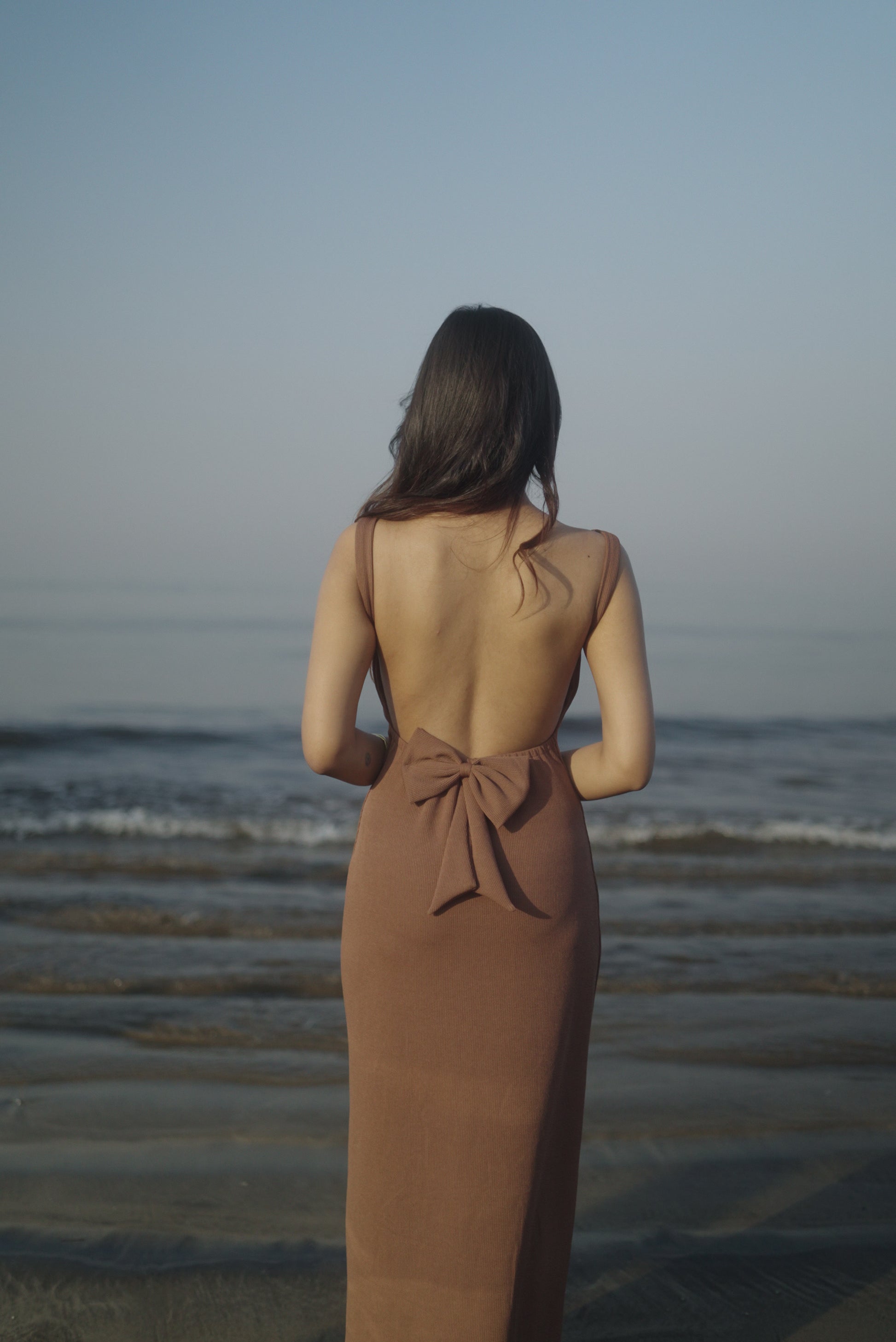 Valentina is a ribbed chocolate brown dress that hugs the body perfectly, offering a flattering fit that feels like it was made just for you. The dress is beautifully finished with a delicate bow at the back, adding an extra touch of charm and femininity.It definitely makes you feel like a modern day princess.